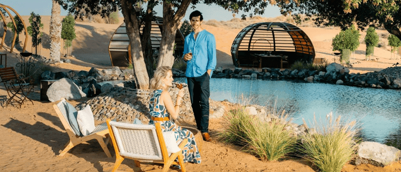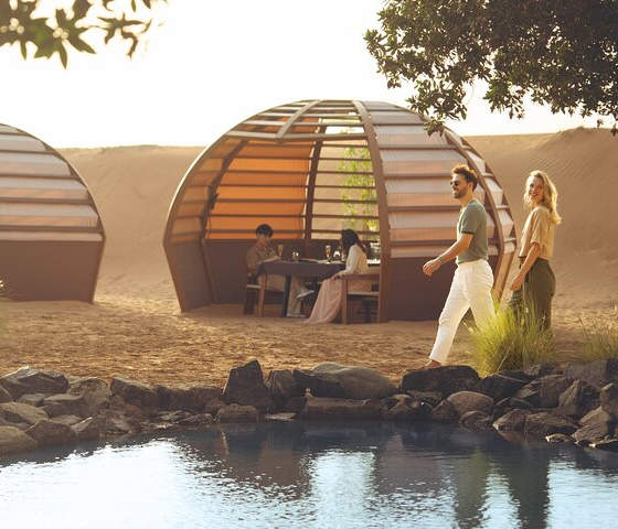 • Seating arrangement: Comfortable seating is arranged for guests to relax and unwind while looking at the golden dunes.