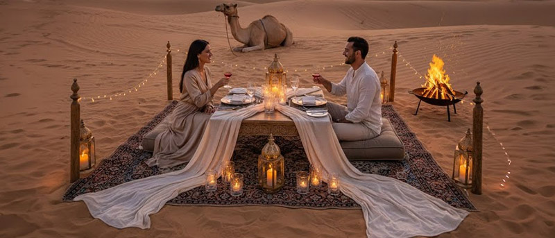 - Exclusive private desert dining: Dine under the stars in a beautifully set private desert location with a curated gourmet menu.
